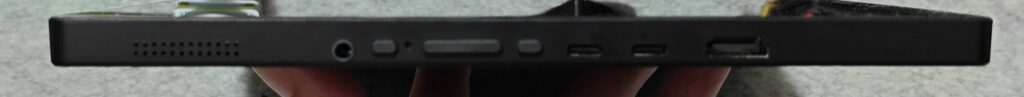左側面に3.5mmイヤホンジャック、入力切り替えやメニューで設定するためのボタン類、USB Type-C x 2、HDMIが並んでいます。あとスピーカーも。