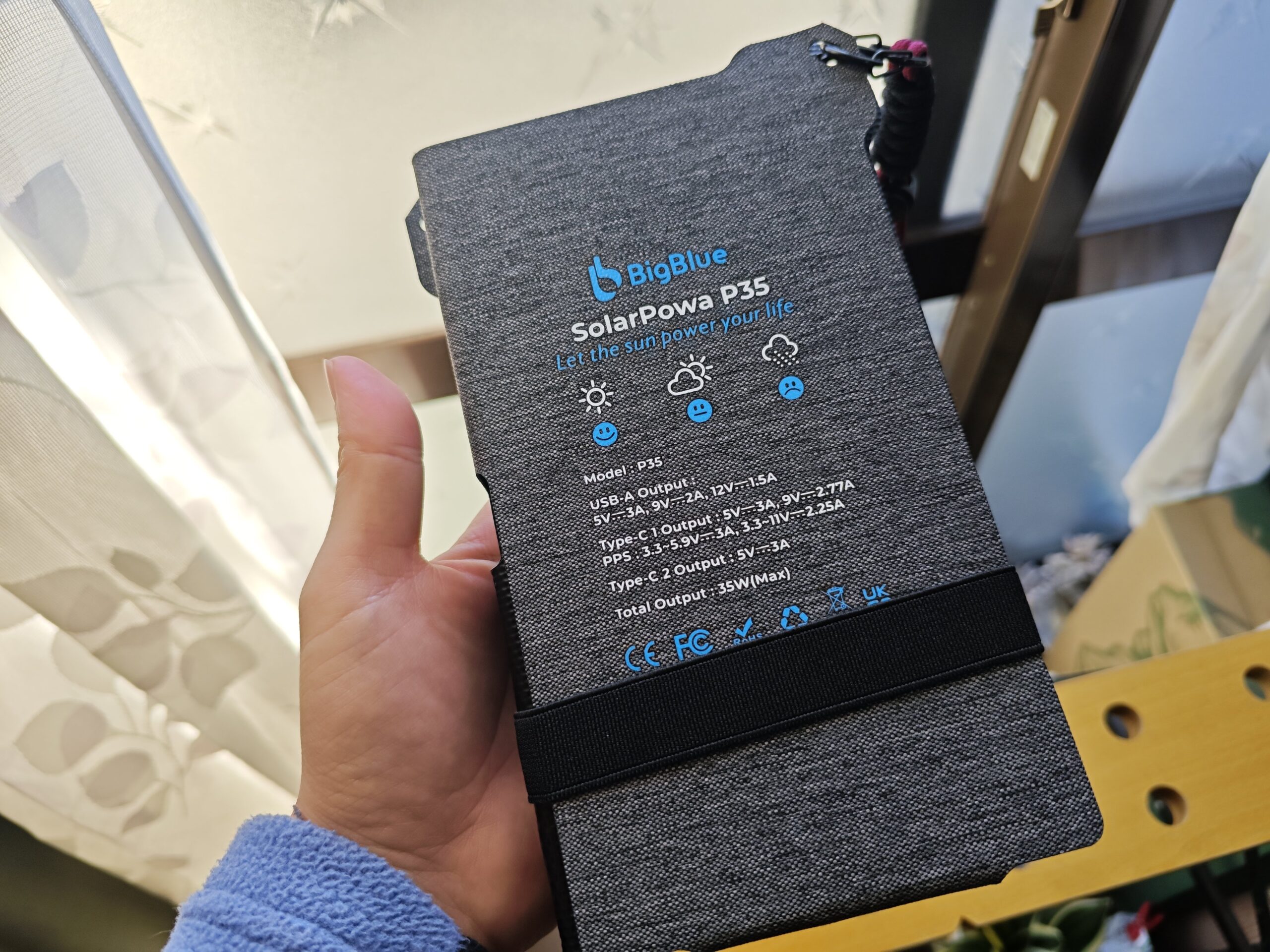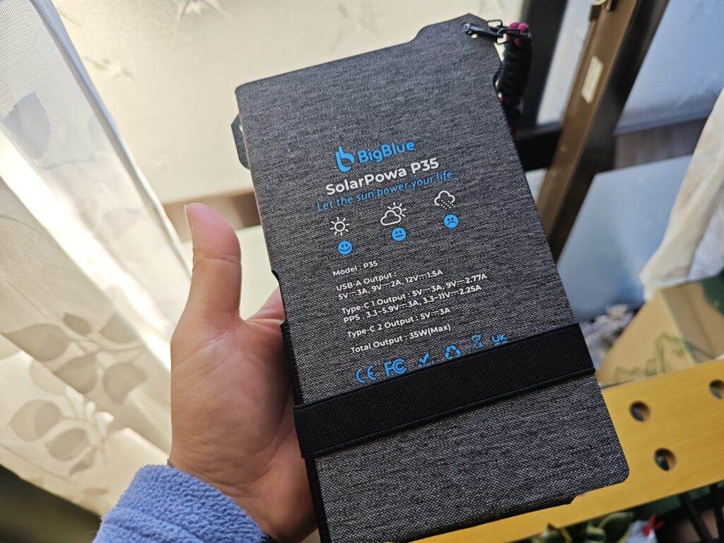 BigBlue SolarPowa P35は単ポートでMAX25W出力可能で、軽量コンパクトな可搬性に優れたソーラーチャージャーです。3ポート付いていますが、複数ポートの同時利用はイマイチなので単ポート運用がおすすめ。