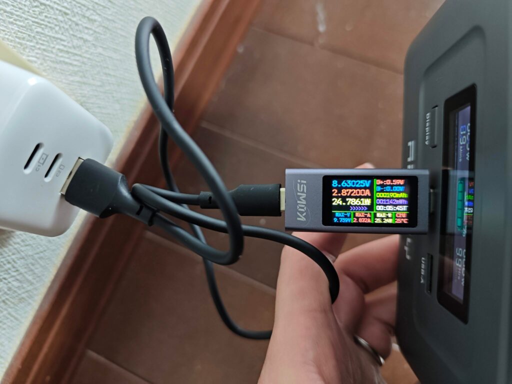 実測値は同じ順で67W、7W、13Wでした。ただし、Type-C1の出力が不安定で、70に近づくと0付近まで落ち、また上がるという挙動。ちょっと怪しい感じです。