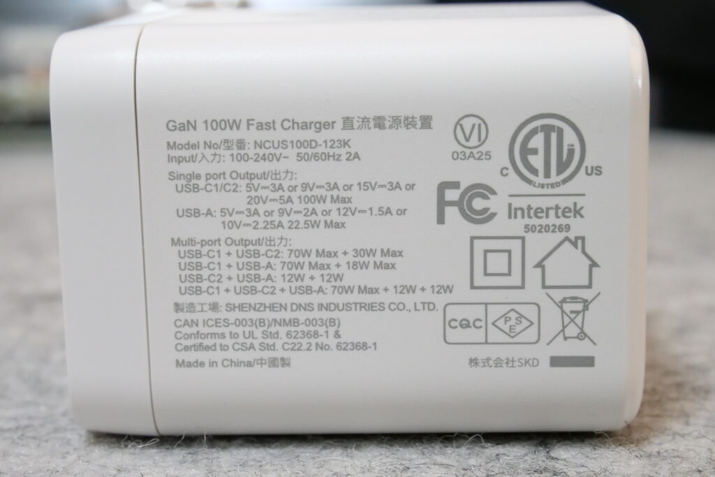 見た目は至ってシンプル。折りたたみ可能なプラグとポートが3つ、底面には出力仕様や各種認証マークの類が印字されています。